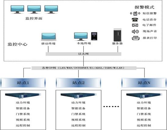 系統基于 TCP/IP 及 SNMP ,具有高度的集中管理理念,不僅能夠將單個機房內各種動力設備與環境設備的各種狀態信息、報警信息、控制命令與歷史數據等進行完整的集中監控,并且能夠將分布在全國各地的多個機房實現跨區域的集中監控。